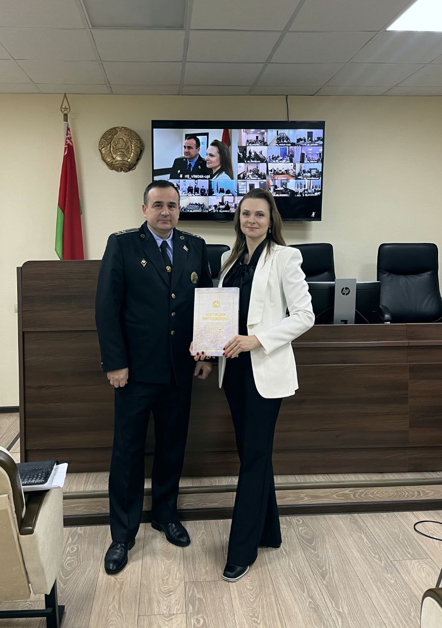 По завершении выступления Николай Николаевич выразил благодарность Виолетте Викторовне за активное взаимодействие и укрепление связей между юридической наукой и практикой, вручив ей памятное издание «Юстиция Витебщины: история длиною в век».