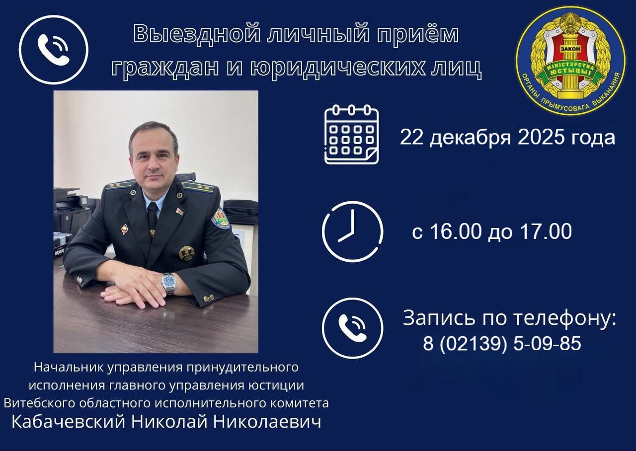 22 декабря 2025 г. в здании отдела принудительного исполнения Городокского района, по адресу: г. Городок, ул. Советская, 14, с 16.00 до 17.00 часов личный прием граждан, в том числе индивидуальных предпринимателей, их представителей и представителей юридических лиц проведет заместитель начальника главного управления юстиции Витебского облисполкома - начальник управления принудительного исполнения Николай Николаевич Кабачевский по вопросам, относящимся к компетенции управления принудительного исполнения.