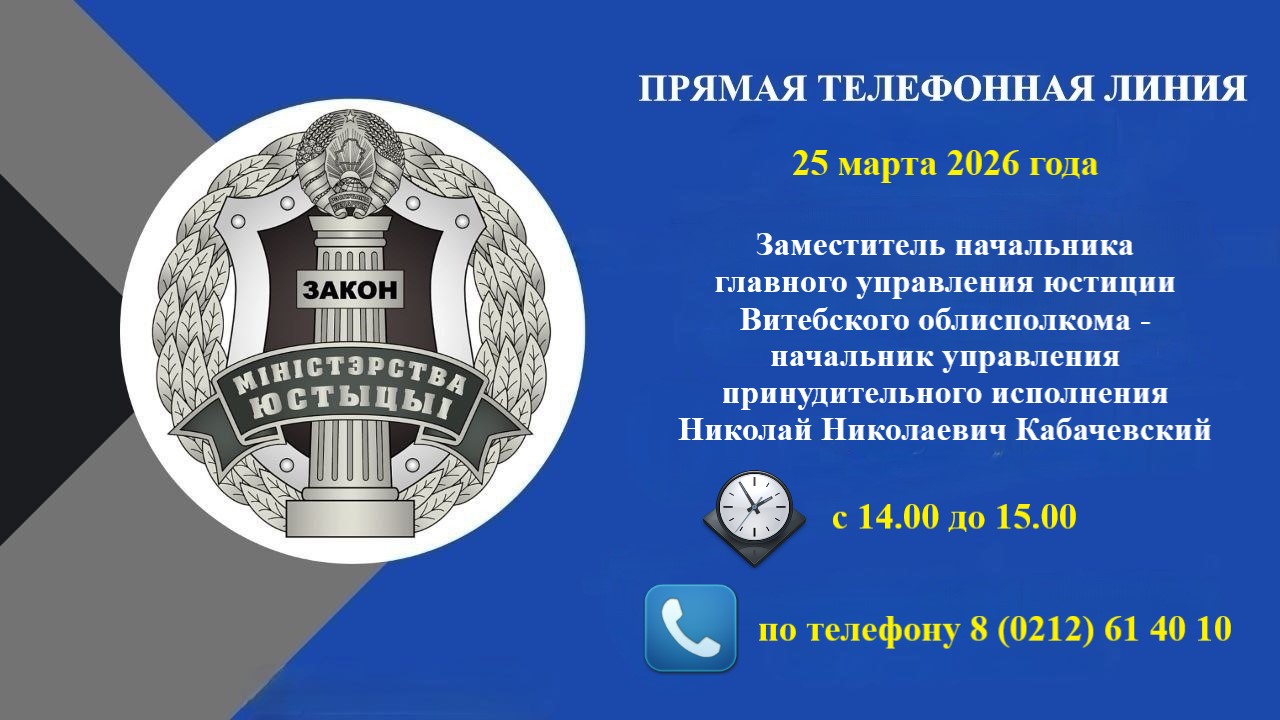 25 марта 2026 г. с 14.00 до 15.00 часов заместитель начальника главного управления юстиции Витебского облисполкома - начальник управления принудительного исполнения Николай Николаевич Кабачевский проведет прямую телефонную линию.