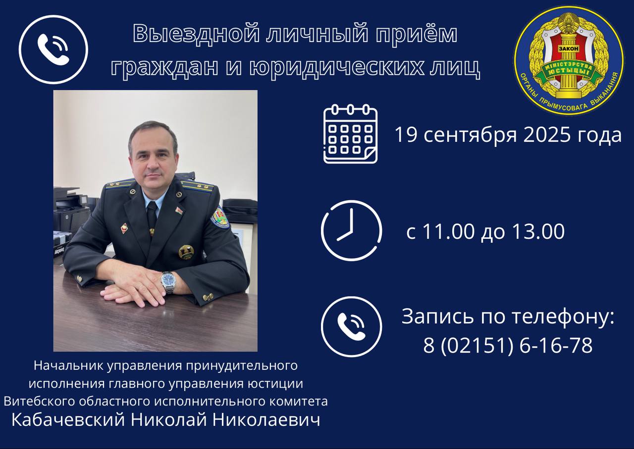г. Верхнедвинск, ул. Ленинградская, 71/1, с 11.00 до 13.00 часов личный прием граждан, в том числе индивидуальных предпринимателей, их представителей и представителей юридических лиц проведет заместитель начальника главного управления юстиции Витебского облисполкома - начальник управления принудительного исполнения Николай Николаевич Кабачевский по вопросам, относящимся к компетенции управления принудительного исполнения.