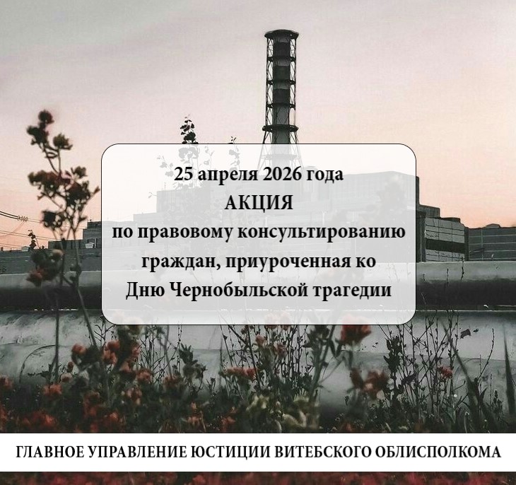 25 апреля 2026 г. главное управление юстиции Витебского облисполкома проведет акцию по правовому консультированию граждан, приуроченную ко Дню памяти о трагедии на Чернобыльской АЭС.